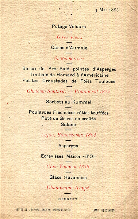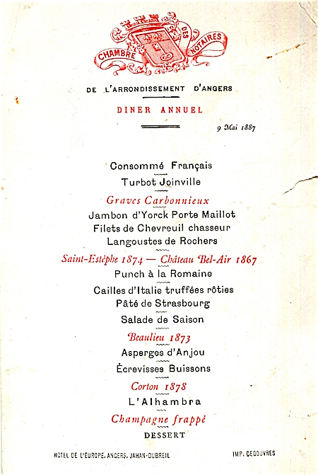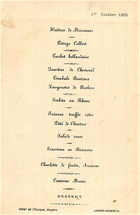 France Angers Hotel De LEurope Menu 1887
