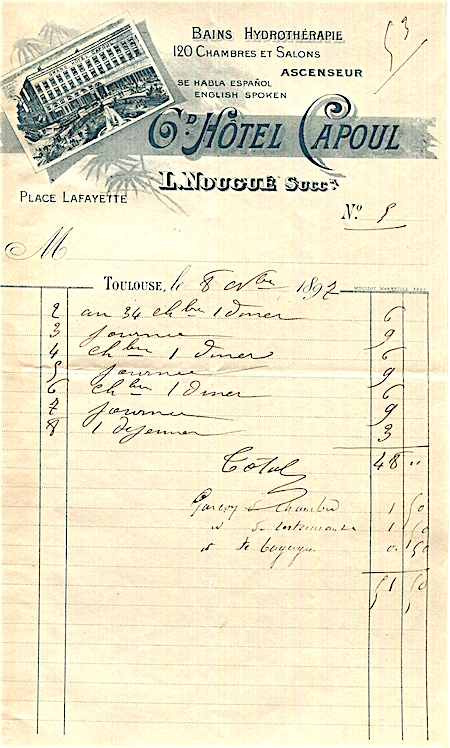 France Bains Hotel Grand Hotel Capoul Receipt 1897