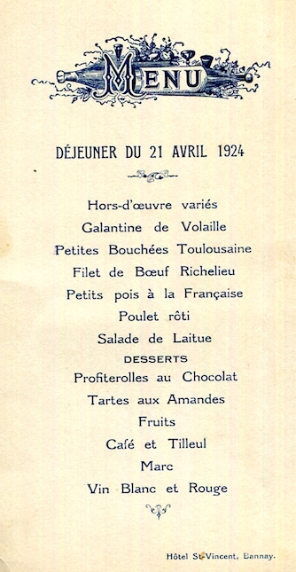 France Bannay Hotel St Vincent Menu 1924