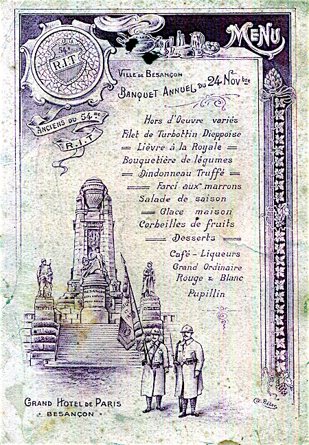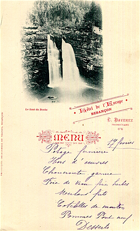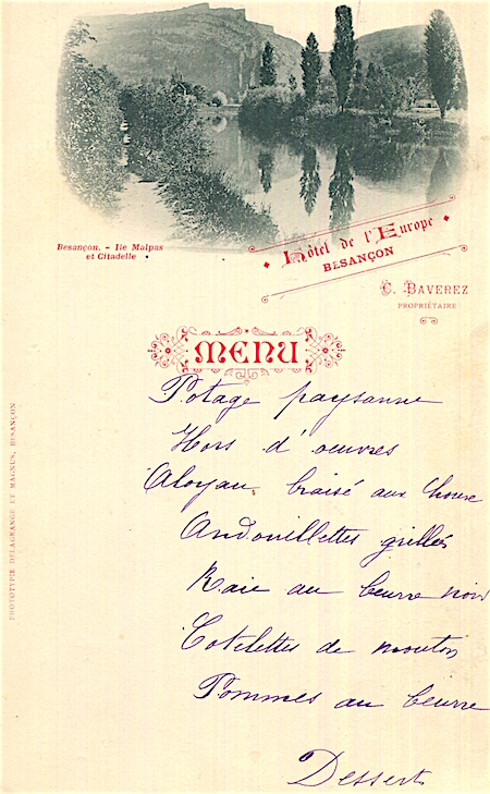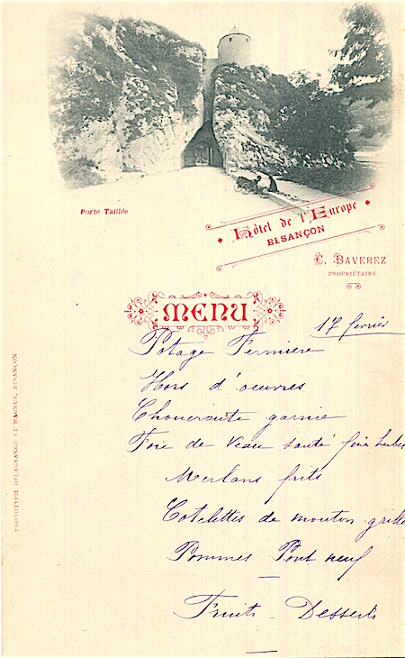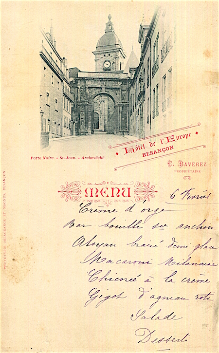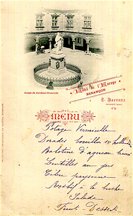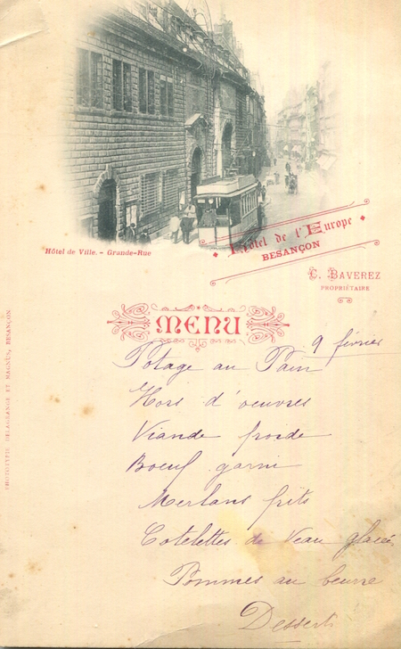 France Besancon Hotel Grand Hotel De Paris Menu 1916