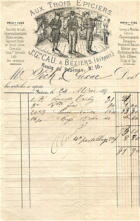 France Beziers Commerce Aux Trois Epiciers Receipt 1870