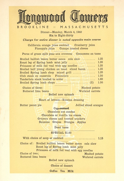 USA Massachusetts Brookline Menu Restaurant Longwood Covers 1940