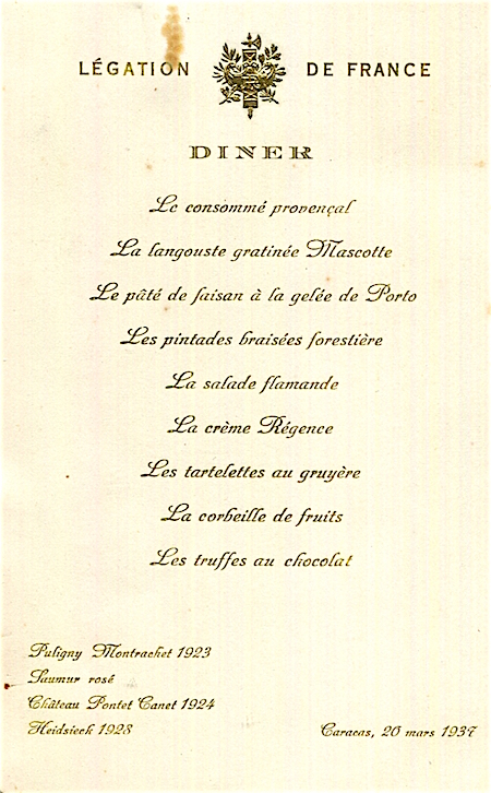 Venezuela Caracas Menu French Legation Diplomatic Dinner 1937