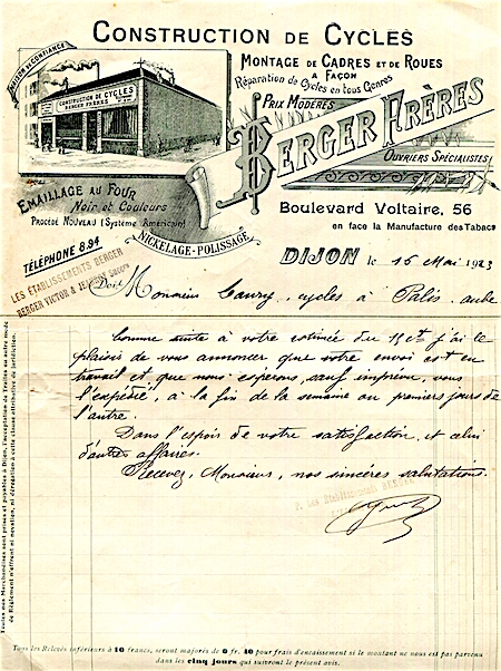 France Dijon Commerce Berger Bros Letter Cycles Makers 1923