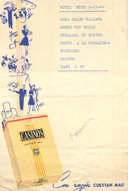 Mexico Oayaka Hotel Ruiz Menu 1944