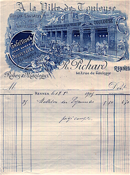 France Rennes Commerce A La Ville De Toulouse Receipt Womans Clothing 1905