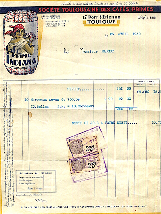 France Toulouse Commerce Cafe Primes Indiana Receipt 1932