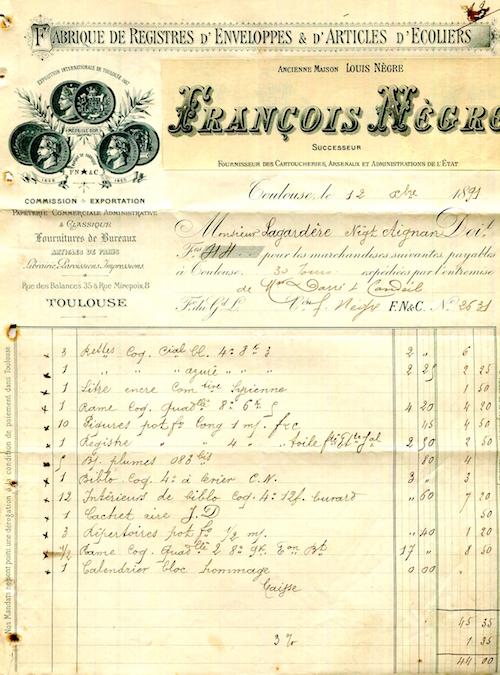 France Toulouse Commerce Francois Negre Receipt 1891