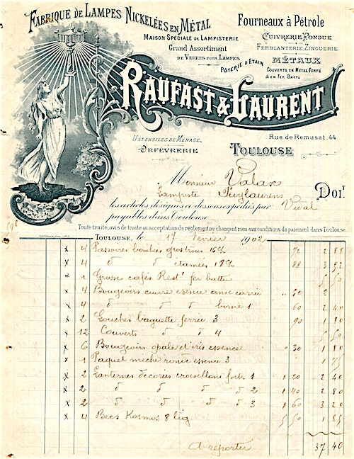 France Toulouse Commerce Raufast Laurent Receipt Metal Lamps 1902