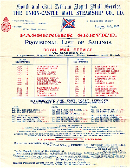 • South Africa Transport Railroads Union Castle Line Braodside Sailing List 1927