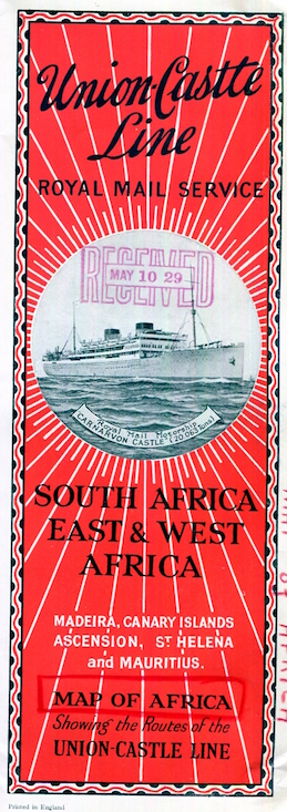 • South Africa Transport Railroads Union Castle Line Map 1929 Front