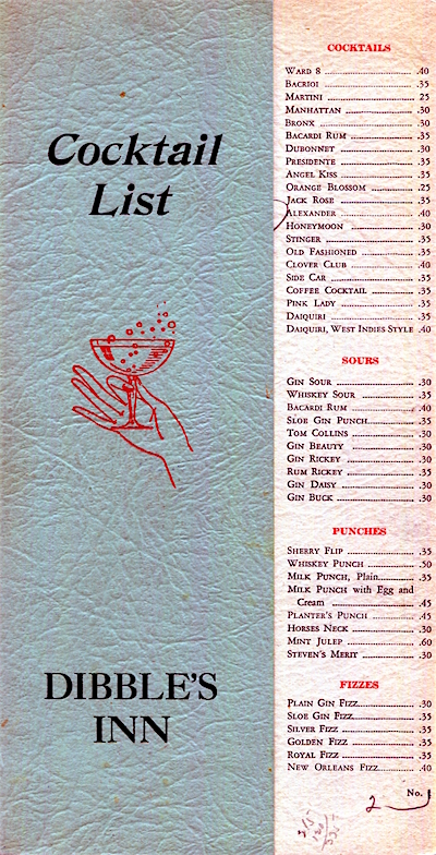 USA New York Cocktail List Restaurant Dibbles Inn Vernon 1938 Front