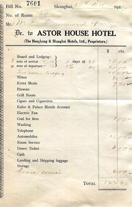 Shanghai Astor House Hotel Bill Head 1924
