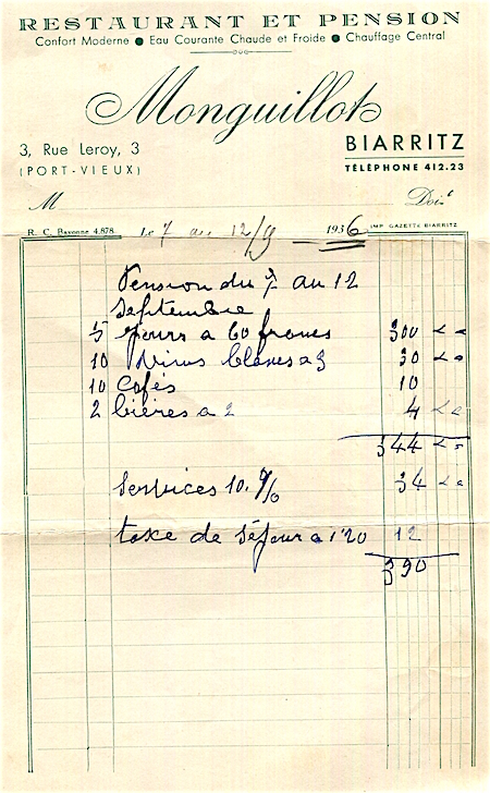 France Biarritz Hotel Monguillot Receipt 1936