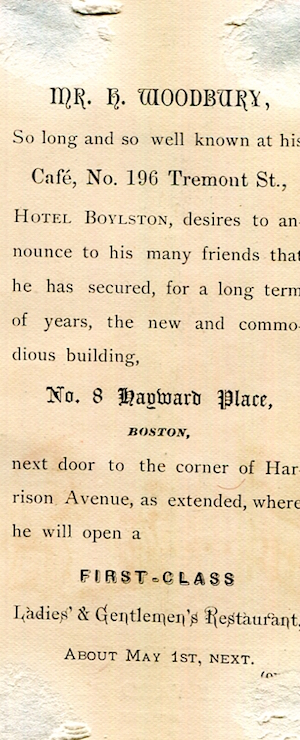 • USA Massachusetts Boston Trade Card Woodburys New Cafe 1880 Back