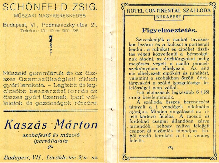 Hungary Budapest Hotel Continental Brochure 1920 Inside