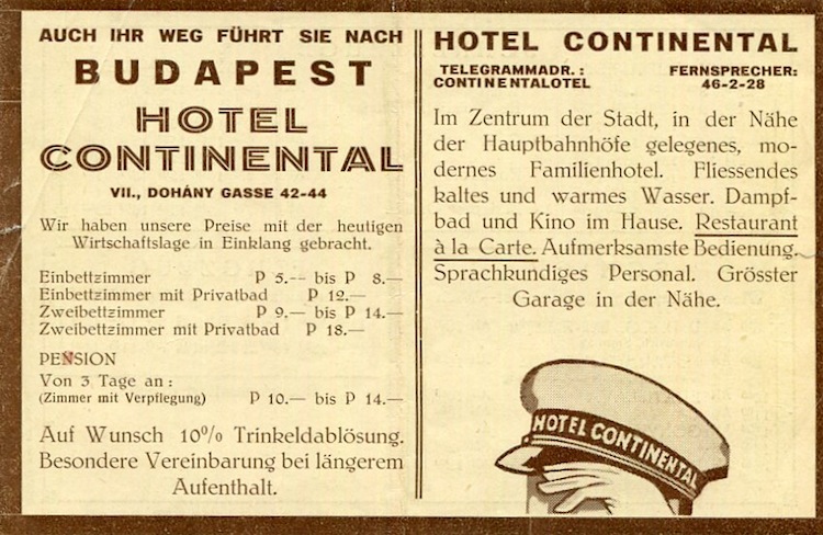 Hungary Budapest Hotel Continental Leaflet 1933 Back