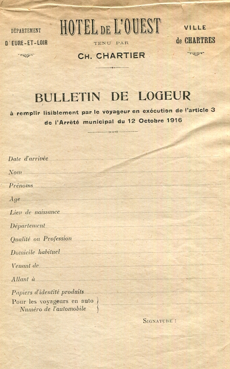 France Chartres Hotel De L Ouest Leaflet Registration 1929