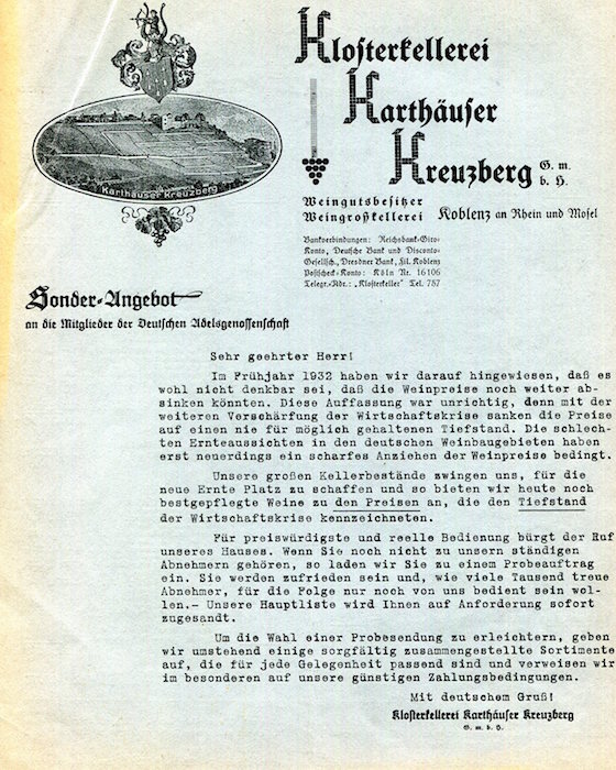 Germany Coblenz Commerce Karthauser Kreuzberg Leaflet Wine Merchant 1932 Front