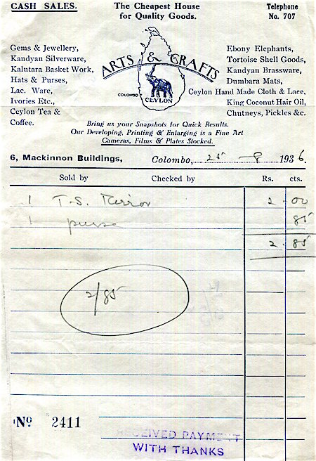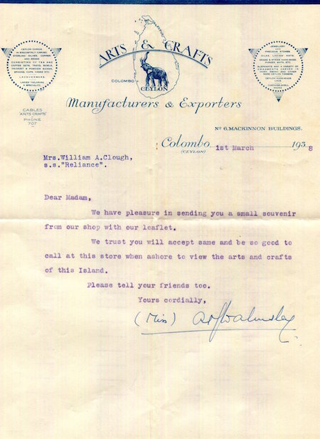 Ceylon Colombo Commerce Ceylon Arts Crafts Receipt 1936