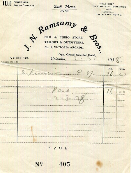 Ceylon Colombo Commerce J N Ramsamy Bros Receipt Tailors 1938