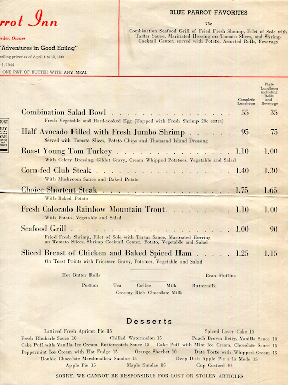 USA Colorado Denver Menu Restaurant Blue Parrot Inn 1944 Inside 2