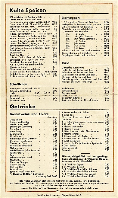Germany Düsseldorf Restaurant Wicküler Schadow Keller Menu 1932 Back