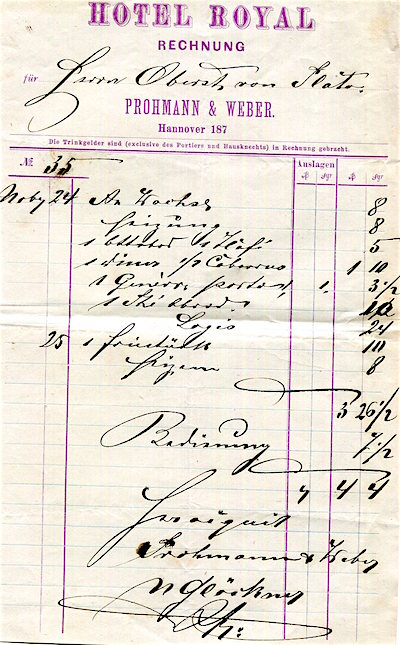 Germany Hannover Hotel Royal Receipt 1870