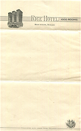 USA Texas Houston Stationery Hotel Rice 1937