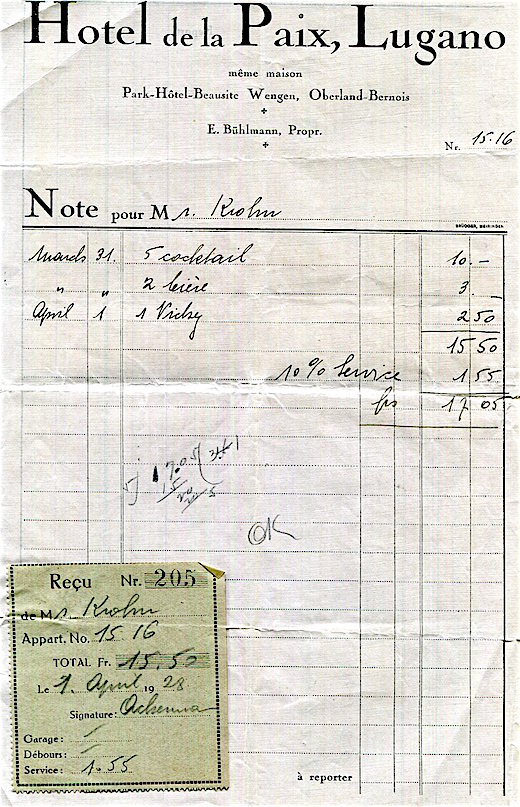 Switzerland Lugano Hotel De La Paix Receipt 1928
