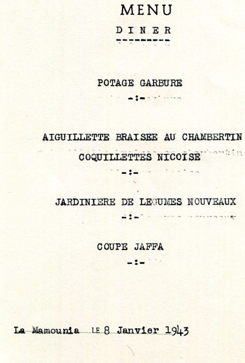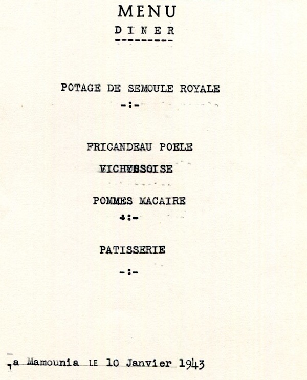 Morocco Marrakech Hotel De La Mamounia Menu 1943-1 Front