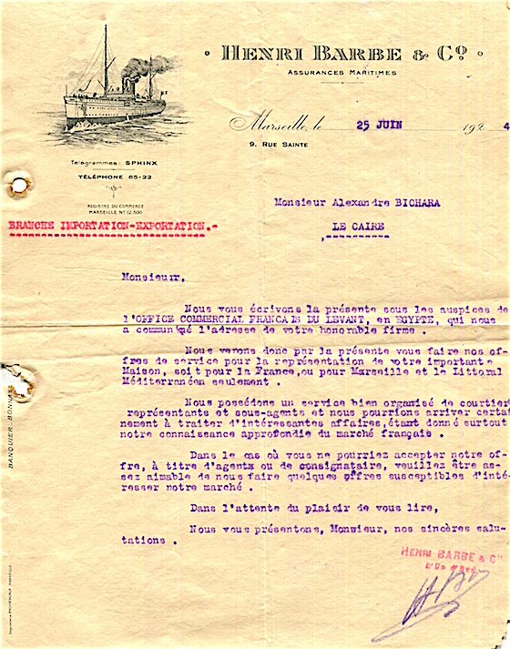 France Marseille Commerce Henri Barbe Letter Maritime Insurance 1924