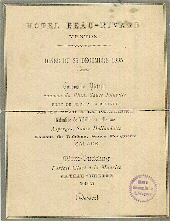 France Menton Hotel Beau Rivage Menu 1885