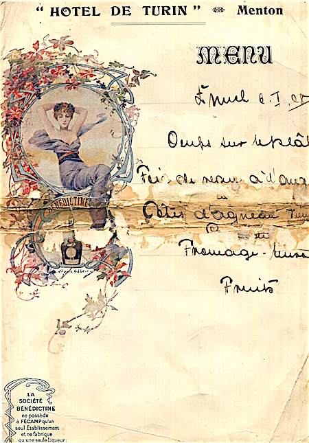 France Menton Hotel De Turin Menu 1908