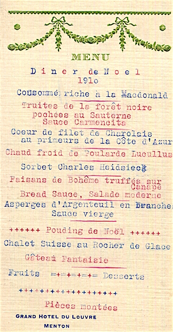France Menton Hotel Grand Du Louvre Menu 1910