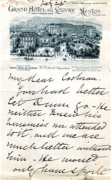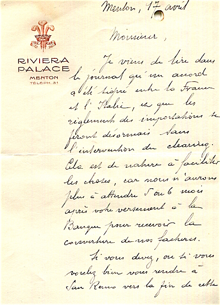 France Menton Hotel Riviera Palace Letter 1930