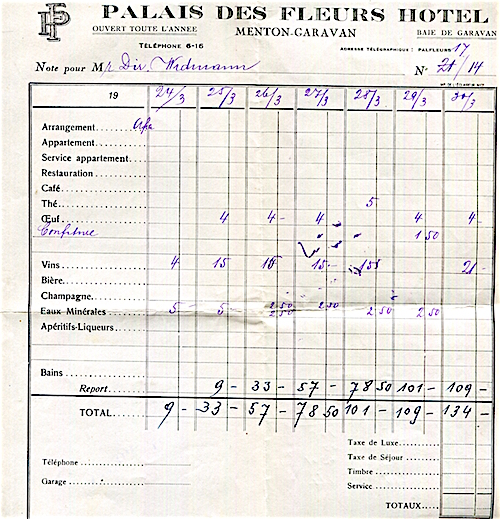 France Menton Hotel Palais Des Fleurs Receipt 1935