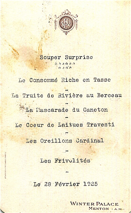 France Menton Hotel Winter Palace Menu 1925