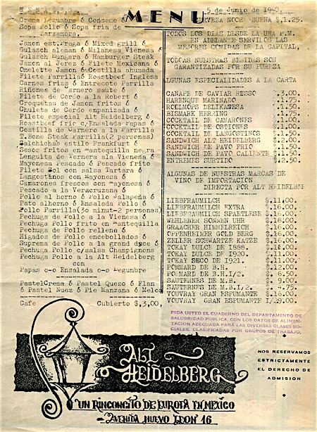 Mexico Mexico City Restaurant Alt Heidelberg Menu 1940 Front
