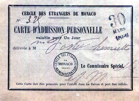 Monaco Monte Carlo Entertainment Casino Ticket 1896