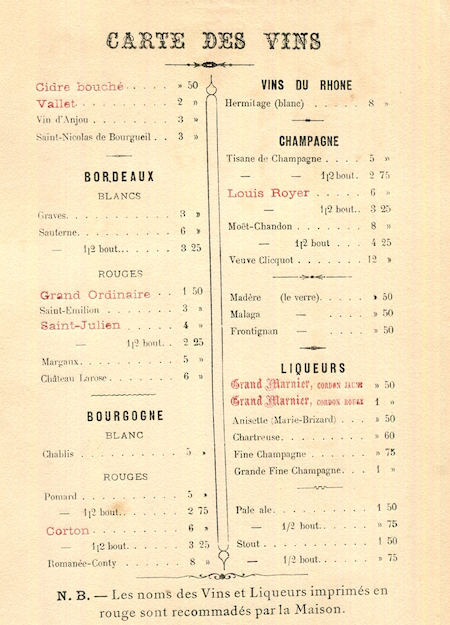 France Nantes Hotel Des Voyageurs Wine Menu 1894 Front