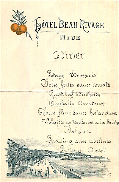 France Nice Hotel Beau Rivage Menu 1922