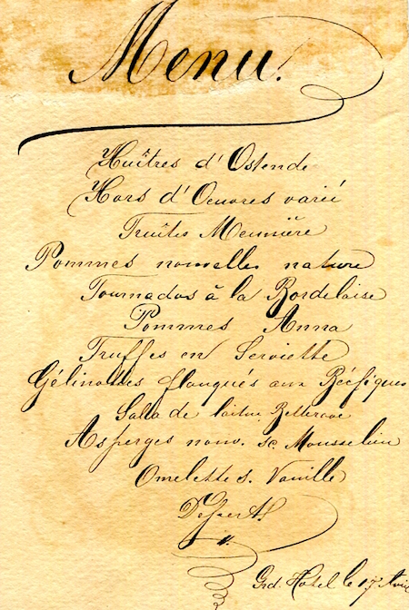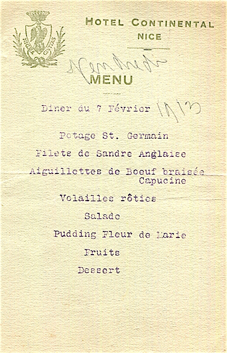 France Nice Hotel Continental Menu 1913
