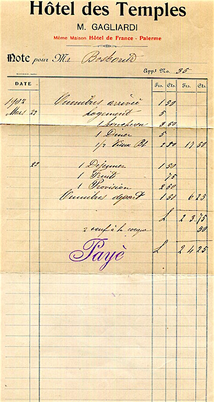 Italy Palermo Hotel Des Temples Receipt 1902