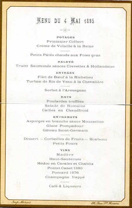 France Paris Menu Hotel Continental 1895