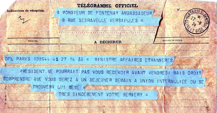 France Paris Telegram Foreign Office To Diplomat Fontenay In Versailles 1924