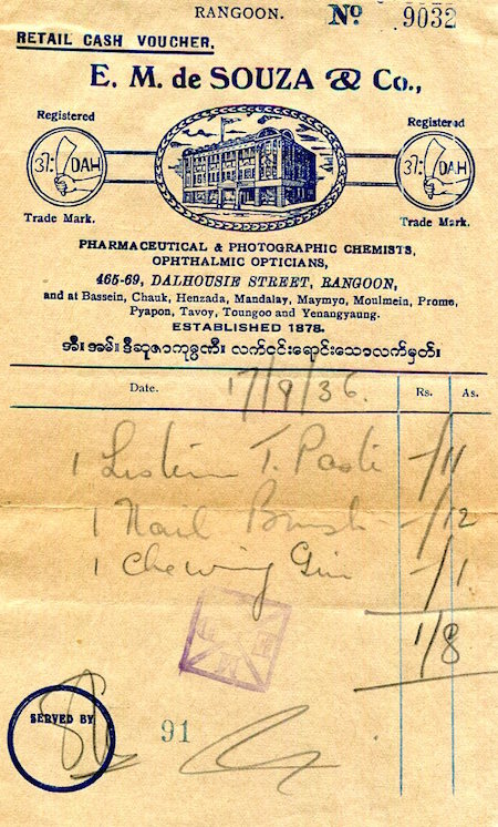 Burma Rangoon Commerce E M de Souza Co Pharmacy Receipt 1936