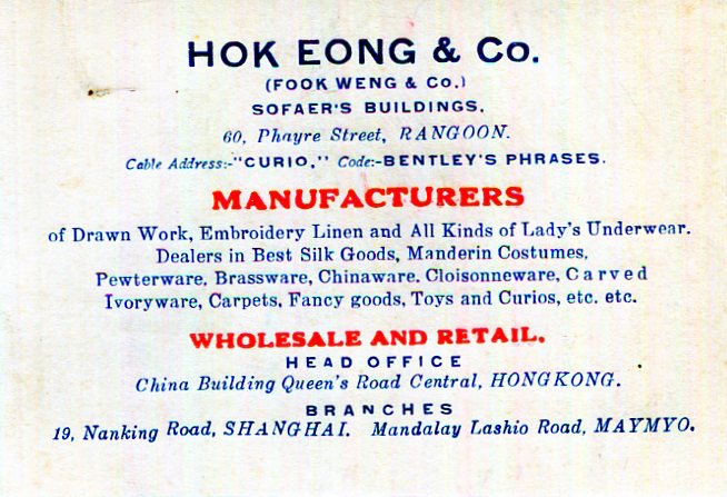 Burma Rangoon Commerce Hok Eong Co Business Card Silk Goods 1920
