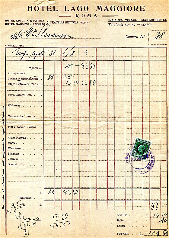 Italy Rome Hotel Lago Maggiore Receipt 1932
