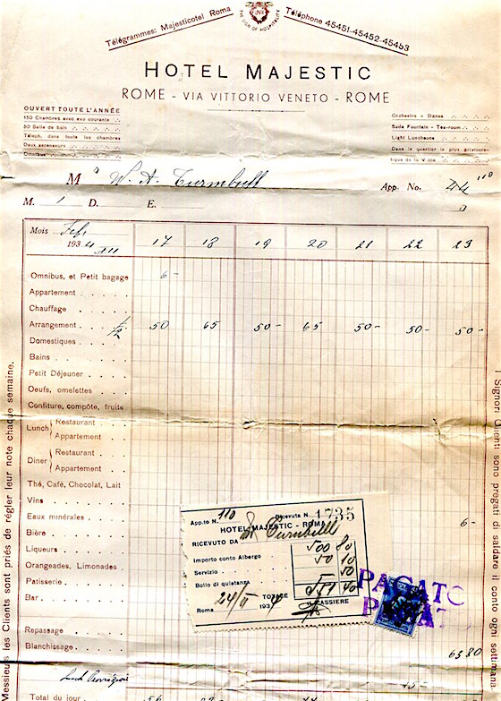 Italy Rome Hotel Majestic Receipt 1934